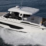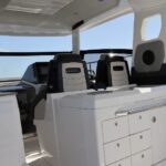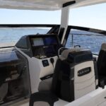 Finished with a refined walnut wood interior and customizable color scheme, the boat offers a stylish and modern feel throughout. The well-thought-out cockpit features an extendable bench seat, removable teak table, electric grill, and refrigerator, creating the perfect social space on the water.