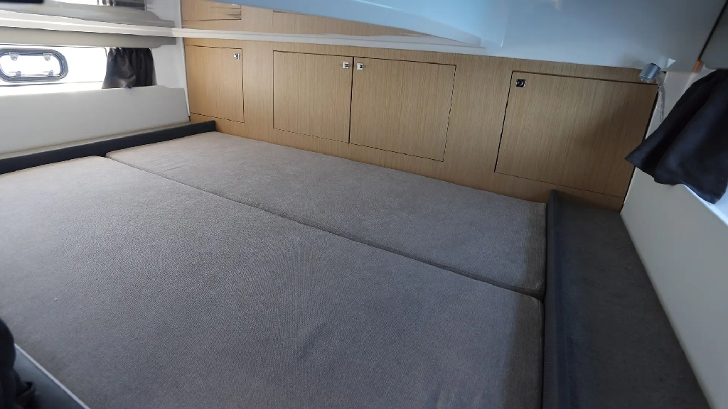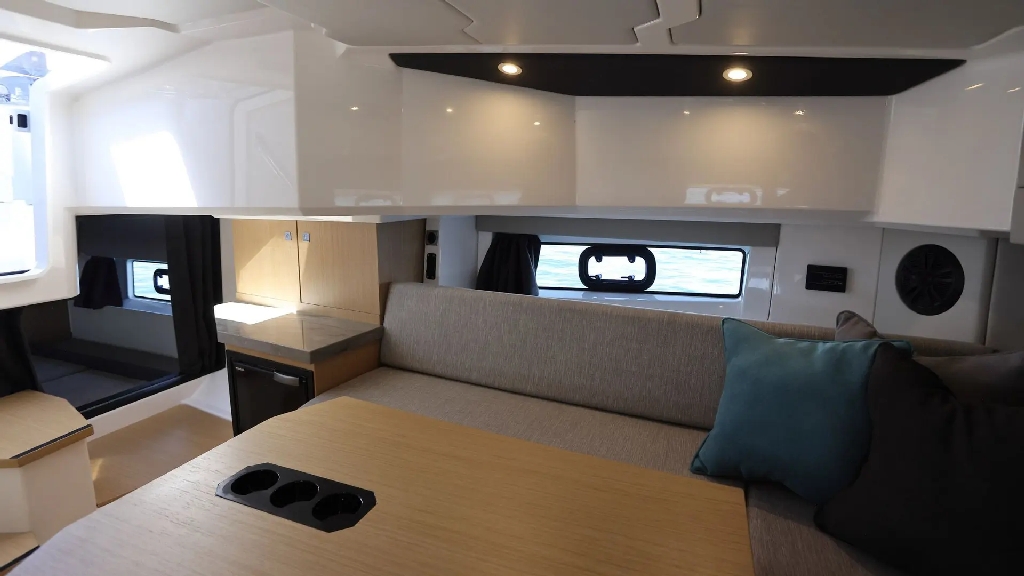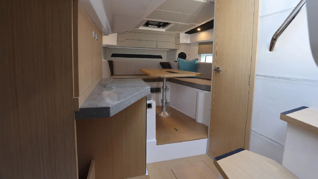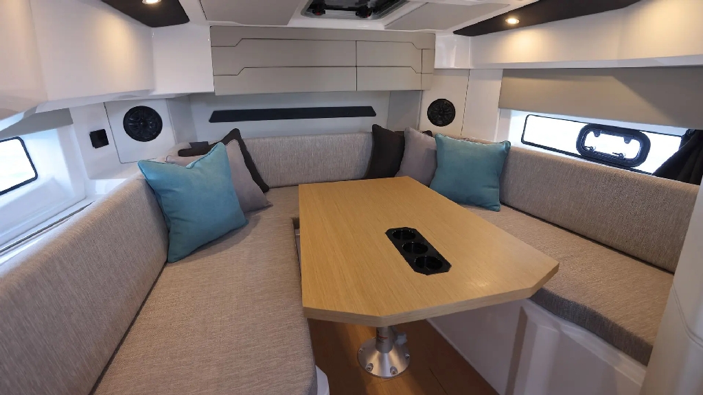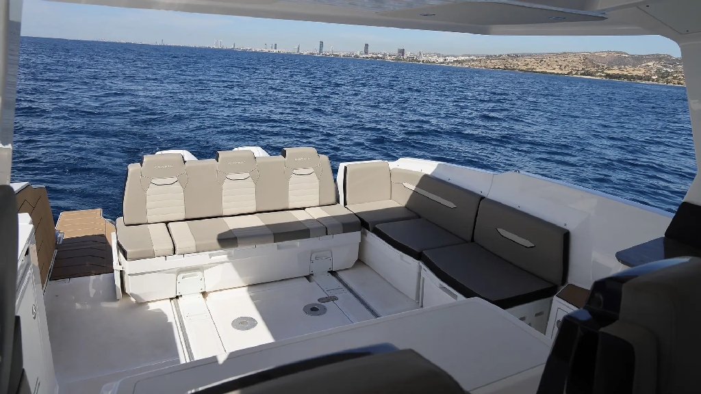 Finished with a refined walnut wood interior and customizable color scheme, the boat offers a stylish and modern feel throughout. The well-thought-out cockpit features an extendable bench seat, removable teak table, electric grill, and refrigerator, creating the perfect social space on the water.