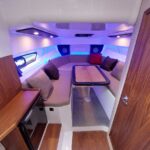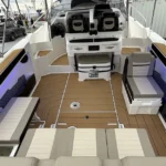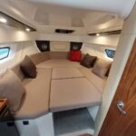 The layout is impressively versatile, comfortably accommodating up to 12 persons, with sleeping space for 4 adults. The spacious cockpit seamlessly converts between dining, lounging, and sunbathing areas, while the bow sunbed and open walk-through stern enhance onboard movement and relaxation. Inside, the cabin features high-quality finishes including real walnut flooring, a convertible dinette berth, a mid-cabin sleeping area, and a fully enclosed shower-toilet compartment—making it perfect for weekend getaways.