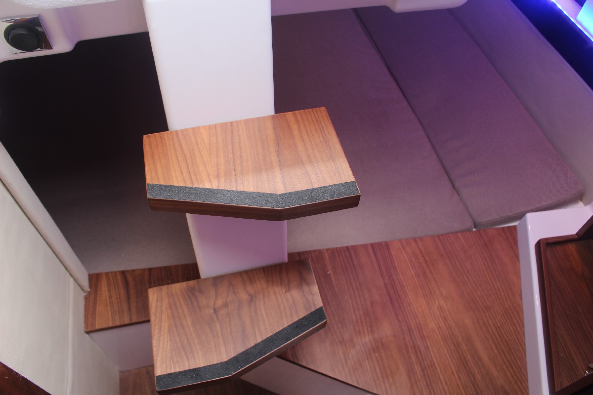 The layout is impressively versatile, comfortably accommodating up to 12 persons, with sleeping space for 4 adults. The spacious cockpit seamlessly converts between dining, lounging, and sunbathing areas, while the bow sunbed and open walk-through stern enhance onboard movement and relaxation. Inside, the cabin features high-quality finishes including real walnut flooring, a convertible dinette berth, a mid-cabin sleeping area, and a fully enclosed shower-toilet compartment—making it perfect for weekend getaways.