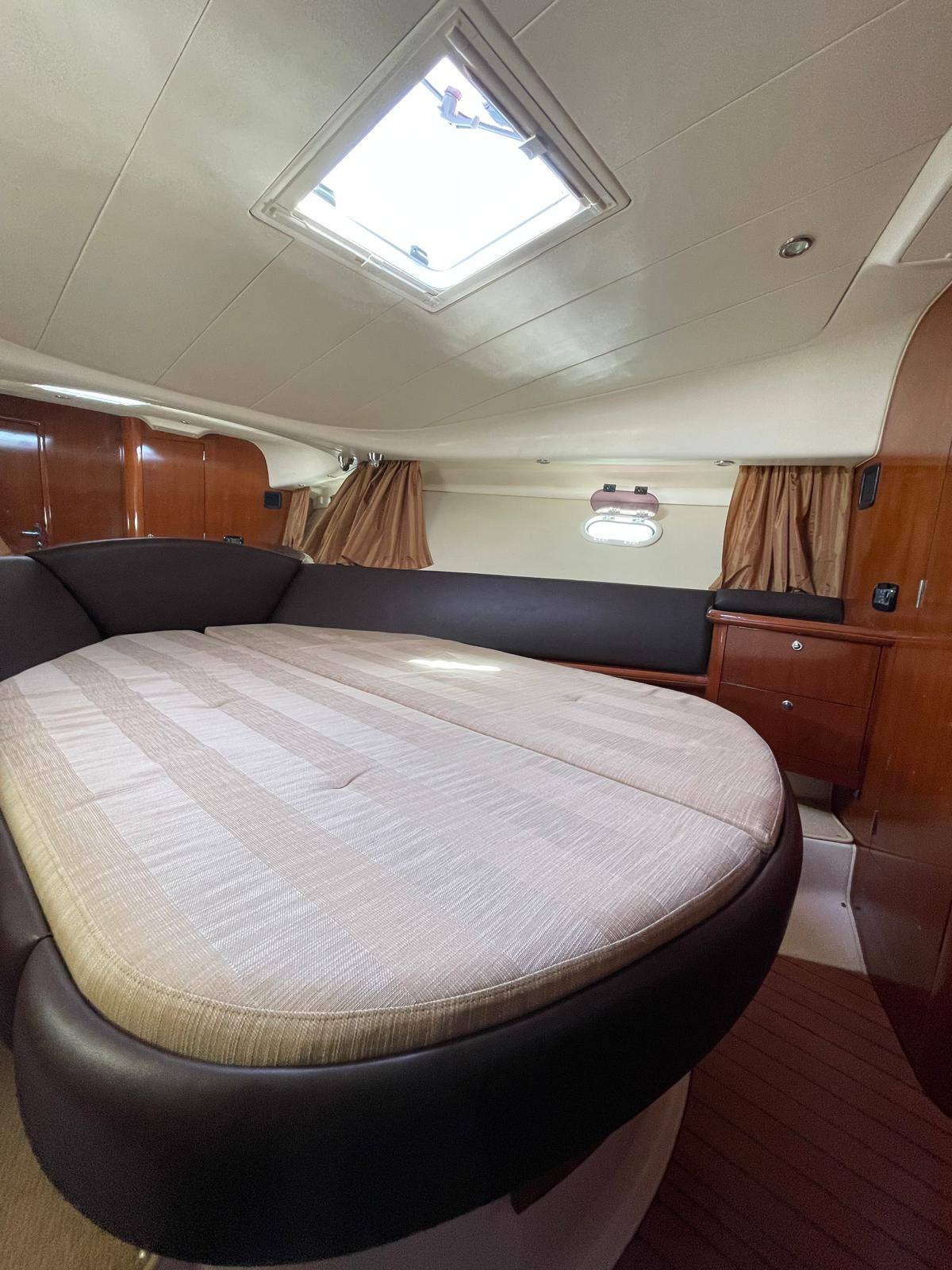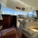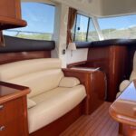 The Prestige 36 (built by Jeanneau) is a compact flybridge motor yacht from 2009, measuring 11.6m long x 3.84m beam with a shallow 0.93m draft, ideal for coastal cruising and island hopping
