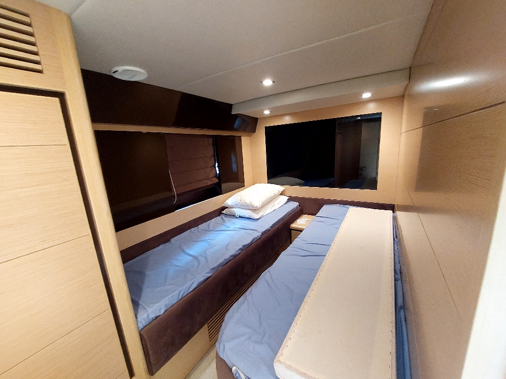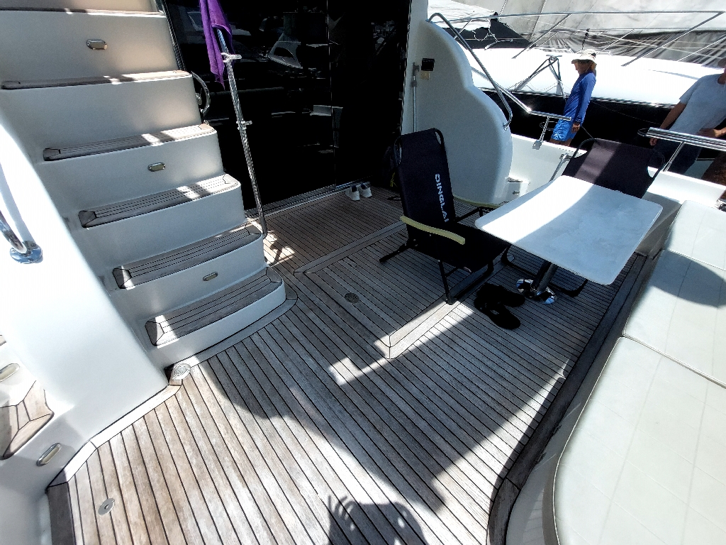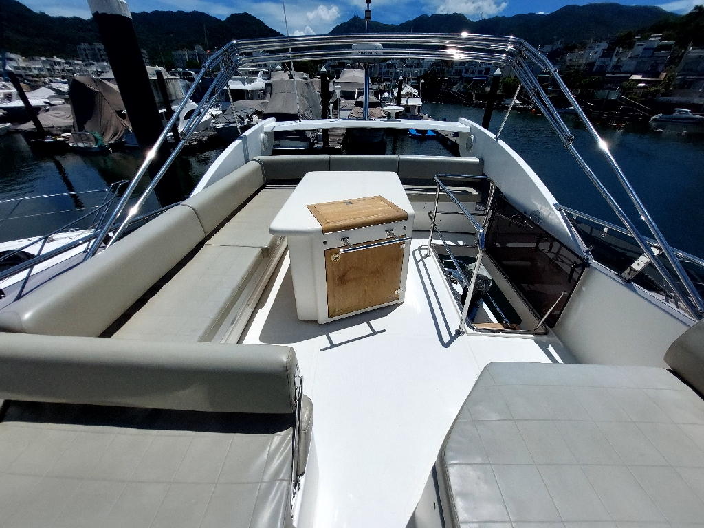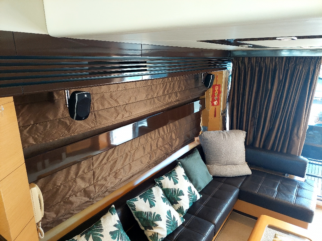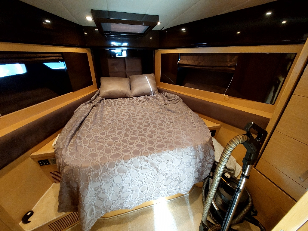 This boat built in 2011, and is around 14 years old. Surprisingly the gelcoat of the boat is shiny and looks like new. This indicates that the boat was very well maintained. It is located in a premium marina club in Hong Kong with full time crew. The non skid floors on the boat were very clean. The edges of the windows inside and outside did not show any signs of leaks. The silicon was intact. The Anchor is also shiny and well maintained. The interior of the boat was very impressive, with every thing original which means it has never been renovated. The condition of things like carpet, sofas, the cabinet door handles, the cieling panels, the wall panels, the bed heads, it was all like new. The toilets were clean and running water and everything was operational.
