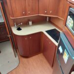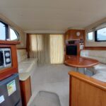 The yacht features a comfortable 2-cabin layout with a large saloon, galley down, flybridge, and aft cockpit. Thanks to her wide beam, the interior feels open and welcoming, with good headroom and generous seating areas. The flybridge provides an excellent space for entertaining, while the cockpit and swim platform add to her versatility.