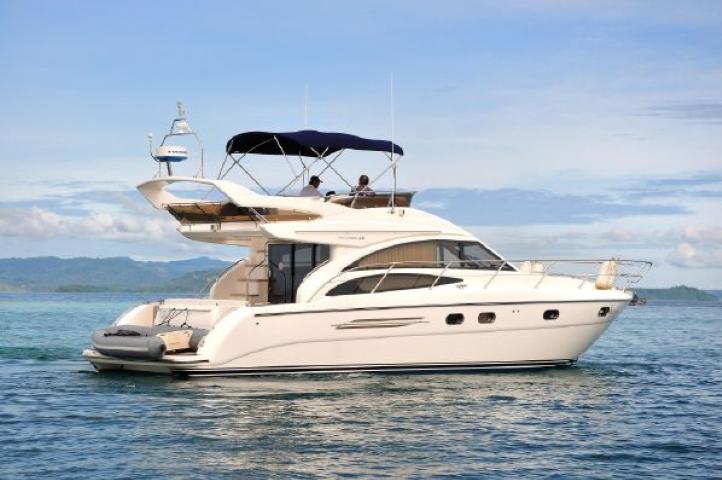 A 42 footer boat, Some like this Princess made in UK, is one of the best in this range. It has well thought space, 2 rooms, a kitchen, a big bathroom, an upper deck called flybridge.